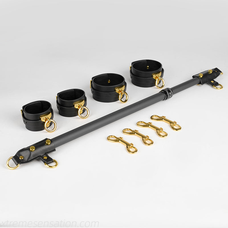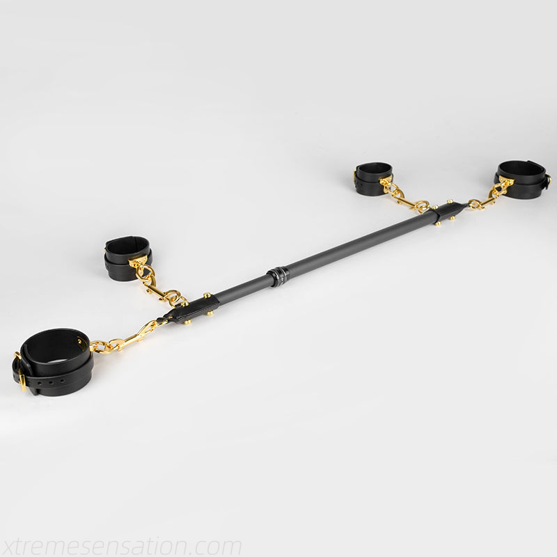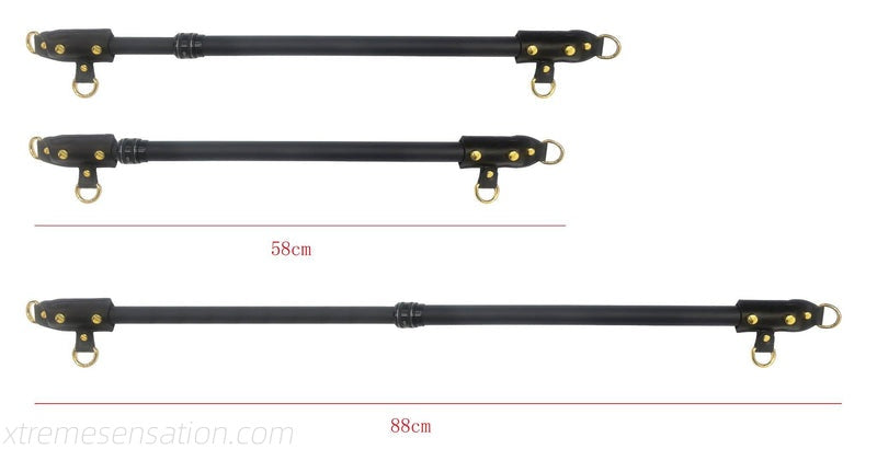 Usage tip:-Fasten matching wrist or ankle cuffs to the spreader bar and twist the center knob to set the preferred length. Ensure all attachments are comfortable and secure before play.