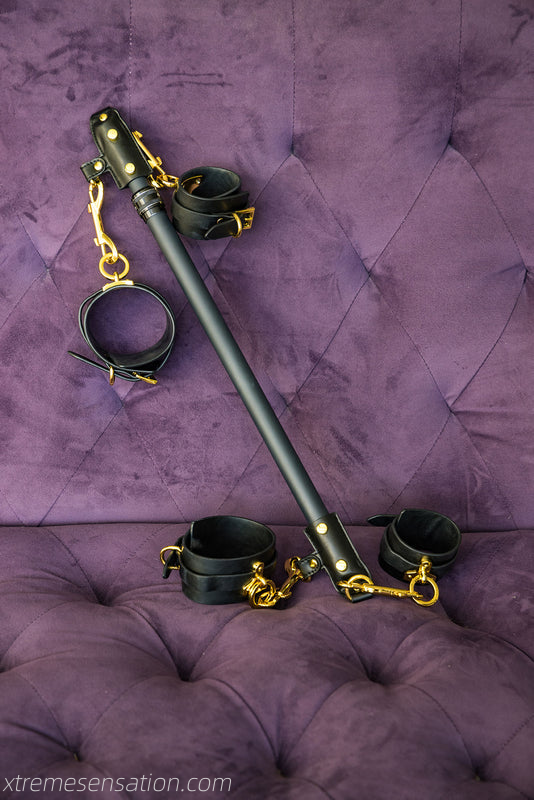 The Noir Carbon Spreader Bar Restraint Set features a lightweight carbon composite spreader bar finished in matte black. Its adjustable length, from 58cm to 88cm, allows users to customize the distance between restrained limbs for optimal comfort and control. Accompanied by matching black leather wrist and ankle cuffs, this set offers a modern and discreet bondage experience. The central twist knob provides quick and simple adjustments, enabling seamless transitions during play. The high-quality materials used ensure durability and ease of maintenance, while the sleek design aligns with contemporary bondage aesthetics. Perfect for various restraint techniques, the Noir Set blends functionality with style, appealing to users seeking a balance of comfort, adjustability, and understated elegance in their restraint gear.